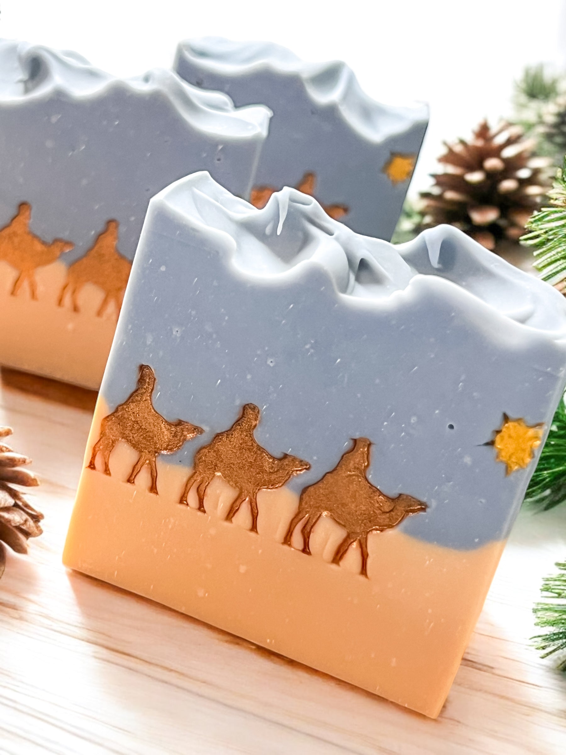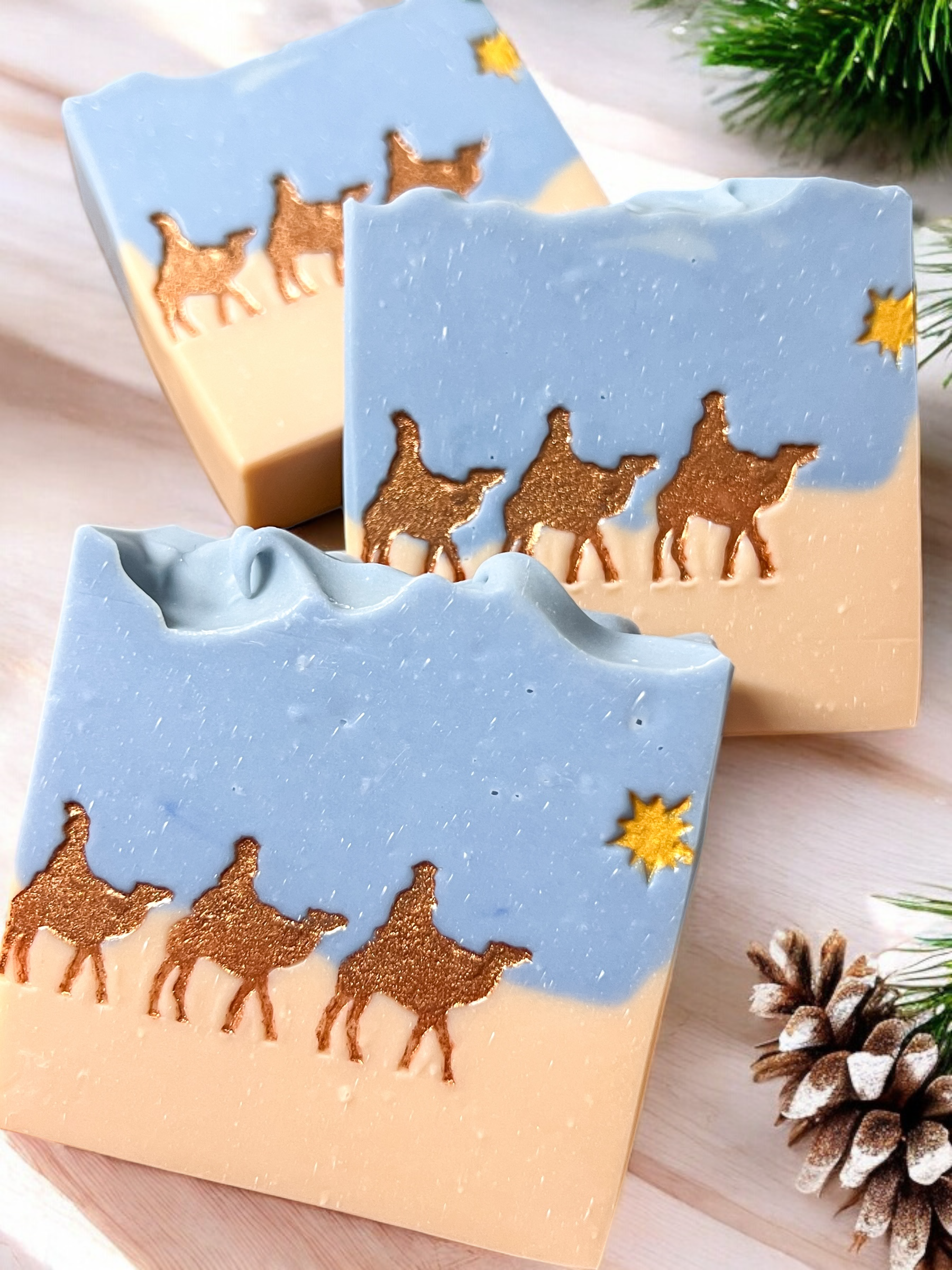 Una pieza artesanal inspirada en la hermosa tradición del Día de Reyes. Este jabón pintado a mano honra el viaje de los Tres Reyes Magos siguiendo la estrella que anunció el nacimiento de Jesús.